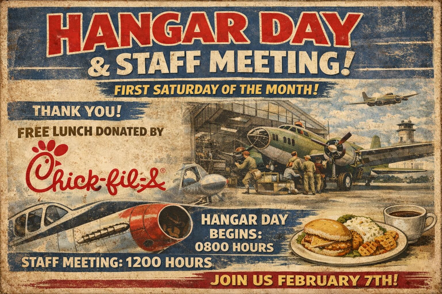 Join us for our Monthly Hangar Day and Staff Meeting, held on the first Saturday of every month at the hangar. Hangar Day kicks off at 0800 hours, giving members and volunteers the opportunity to roll up their sleeves and help with aircraft care, facility upkeep, and special projects that keep our wing mission-ready.